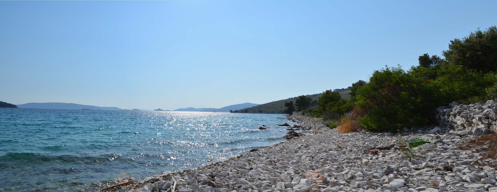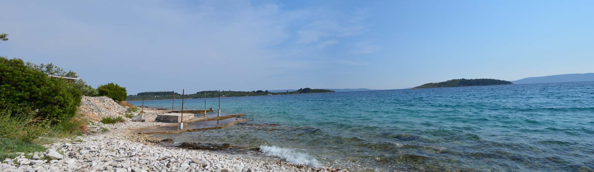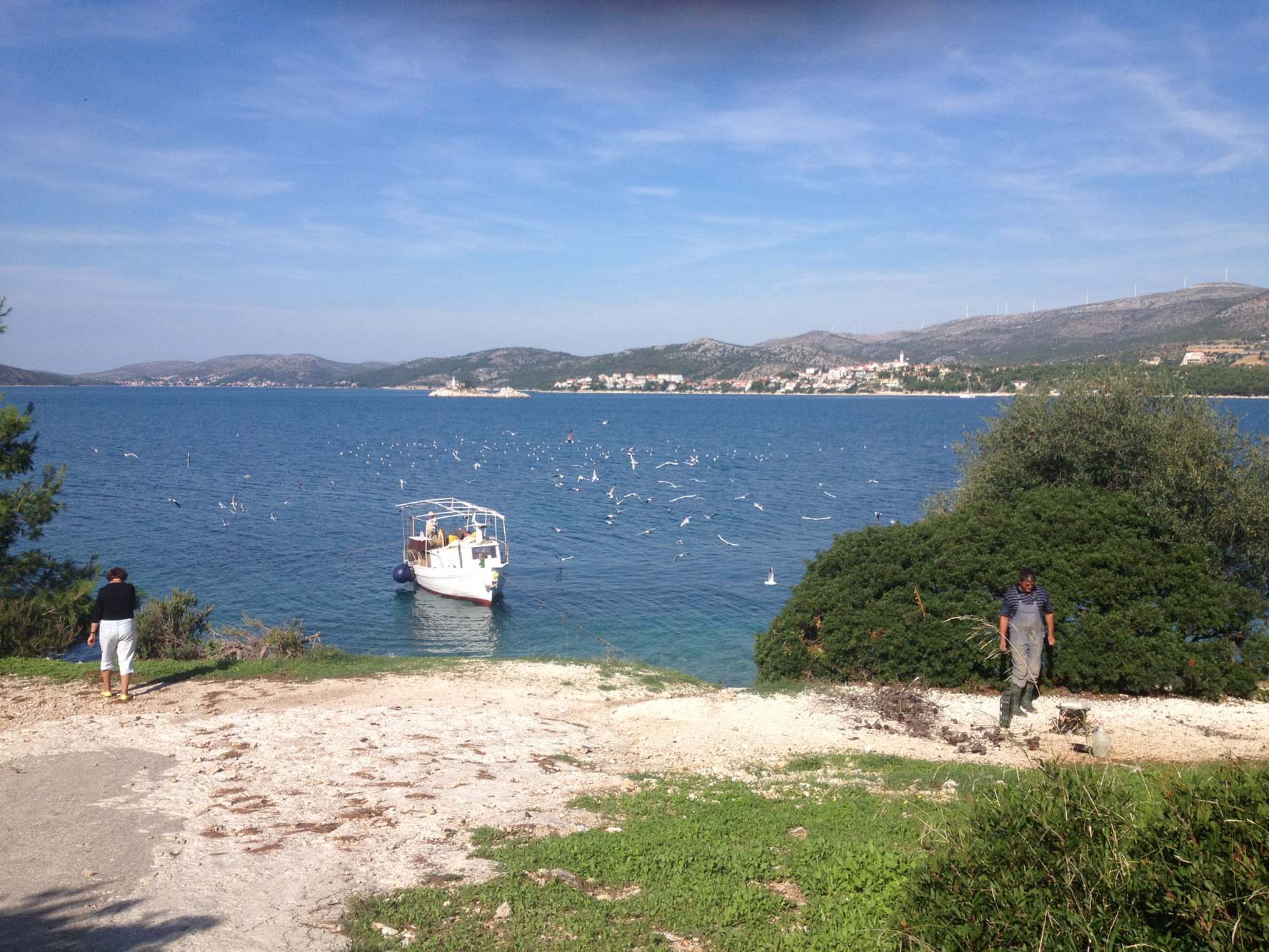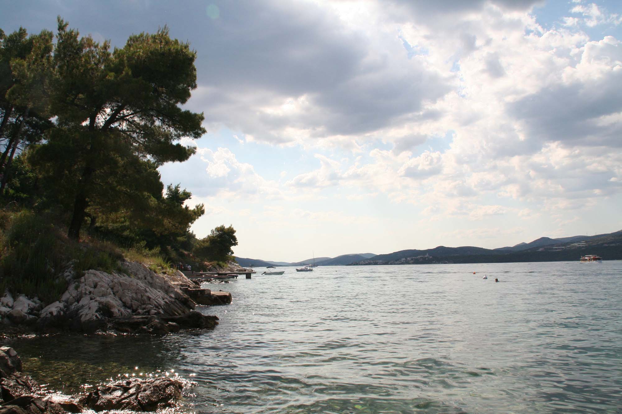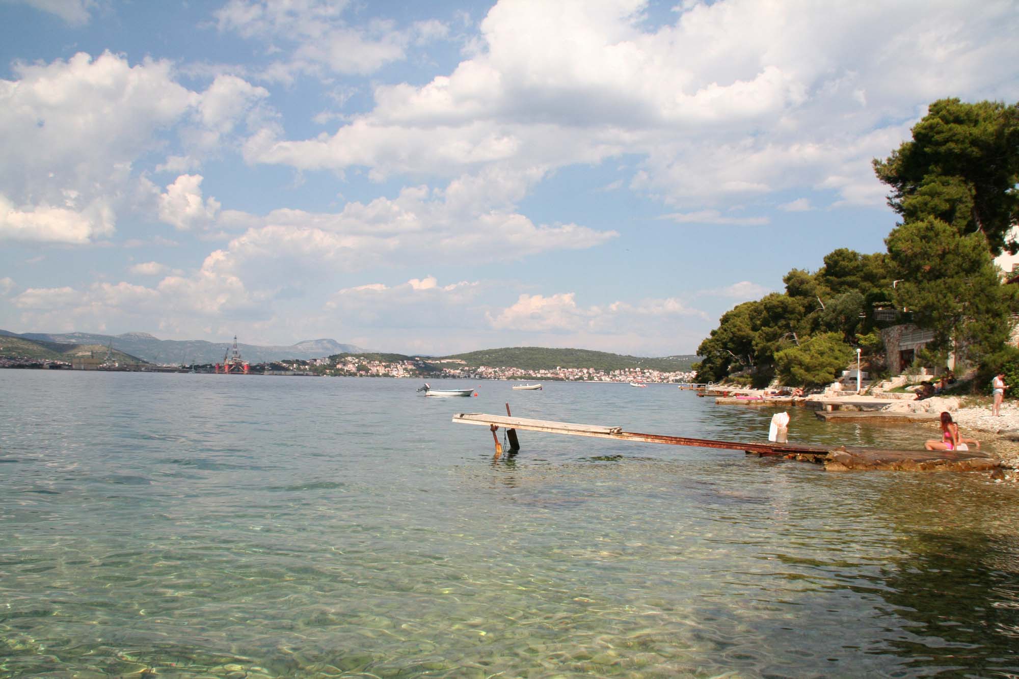 Zur anderen Seite Richtung Festland ist in 10 Minuten Fußweg der Badestrand, mit Liegeflächen, Abgrenzungen im Wasser, Bootsvermietung, Cafe und Restaurant, Spielplatz, Liegen und der Schiffsanlegestelle nach Trogir. Entlang des Kiefernwaldes gibt es 20 Minuten lang individuelle Badeplätze zwischen und auf den Felsen und im Kiefernwald. An der Spitze der Insel weitet sich das offene Meer mit dem Blick auf den Schiffsverkehr.