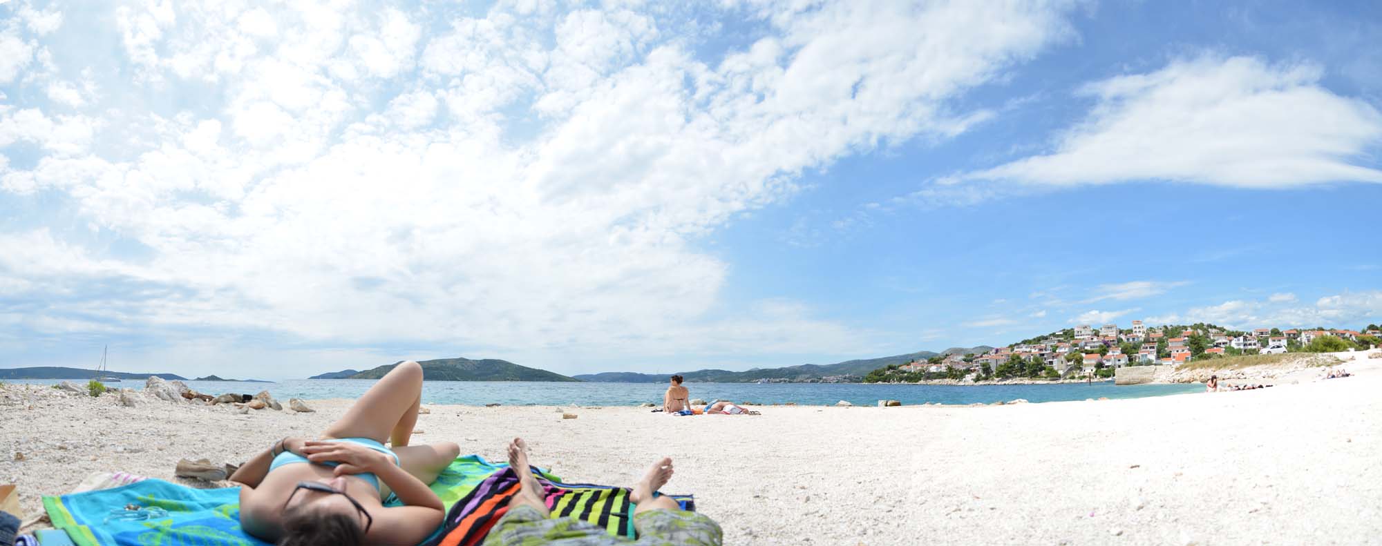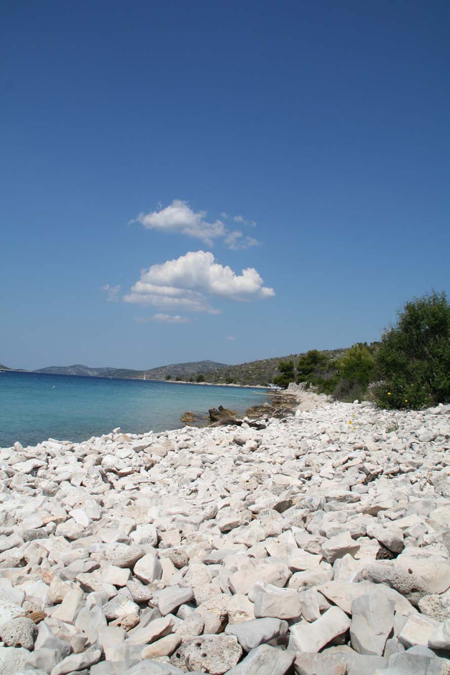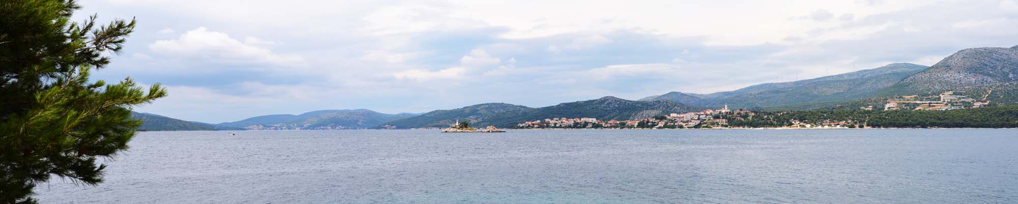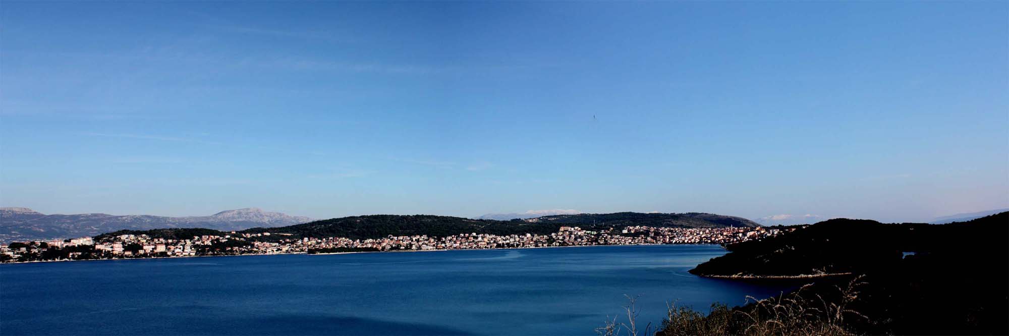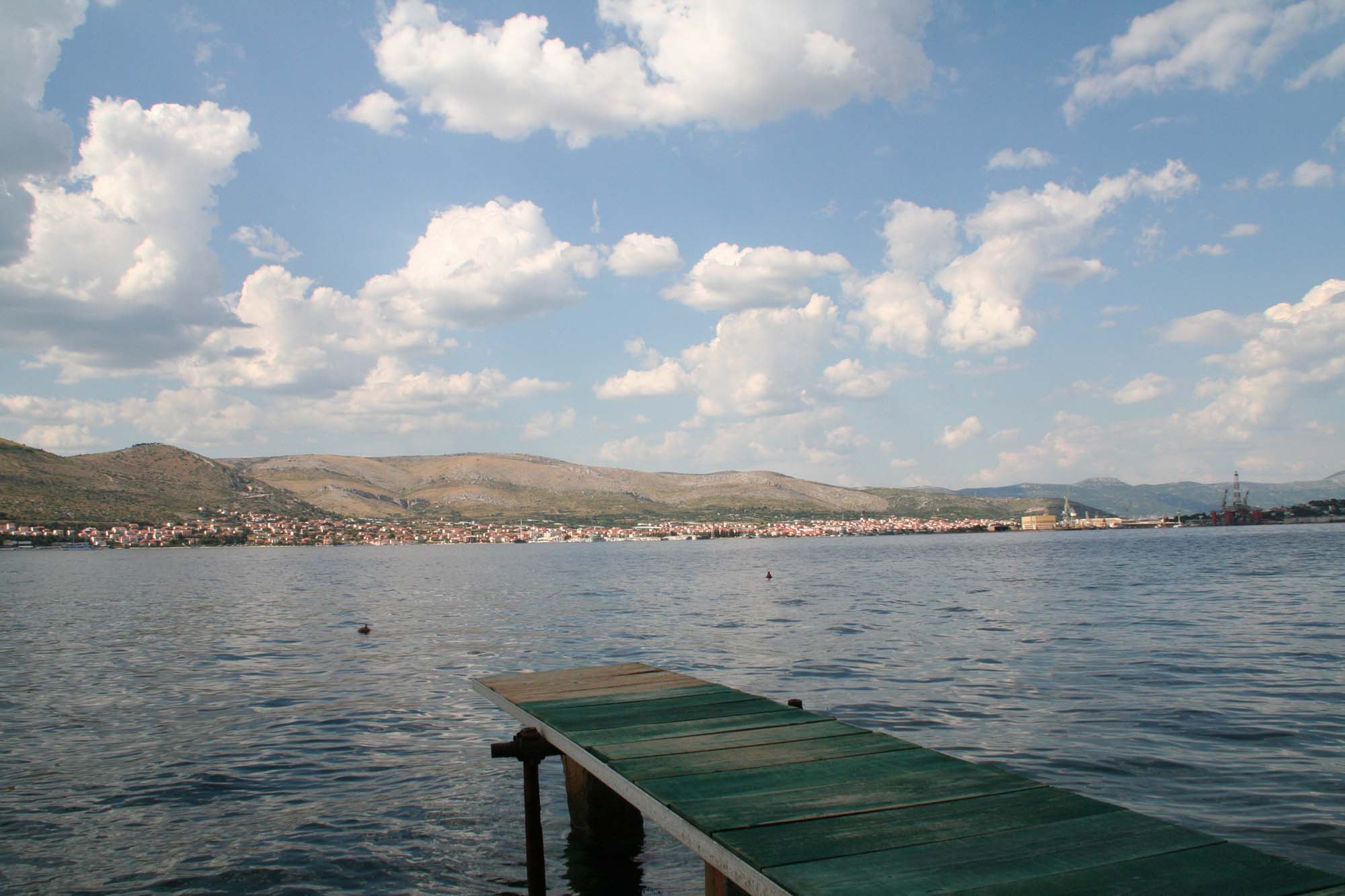Zur anderen Seite Richtung Festland ist in 10 Minuten Fußweg der Badestrand, mit Liegeflächen, Abgrenzungen im Wasser, Bootsvermietung, Cafe und Restaurant, Spielplatz, Liegen und der Schiffsanlegestelle nach Trogir. Entlang des Kiefernwaldes gibt es 20 Minuten lang individuelle Badeplätze zwischen und auf den Felsen und im Kiefernwald. An der Spitze der Insel weitet sich das offene Meer mit dem Blick auf den Schiffsverkehr.
