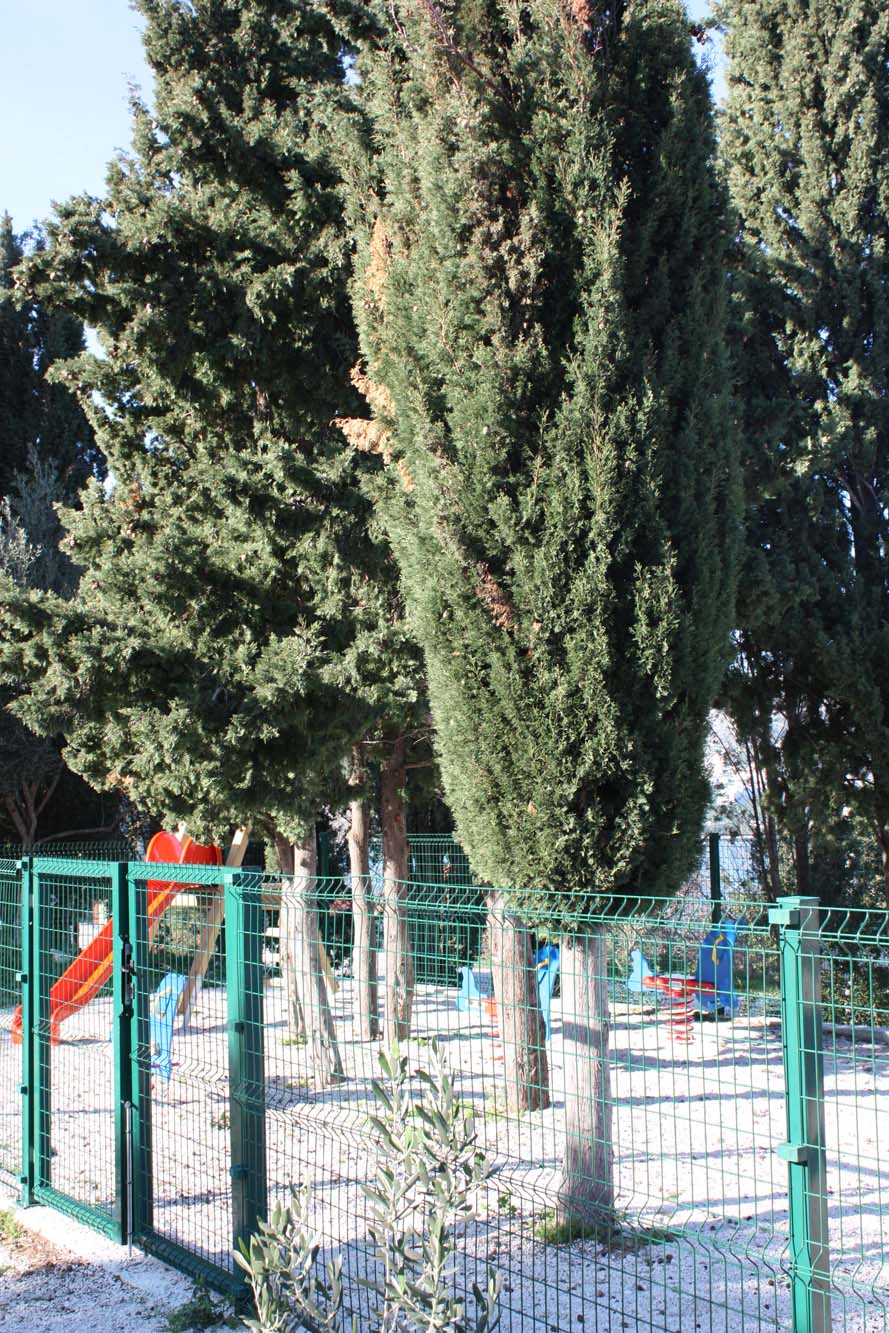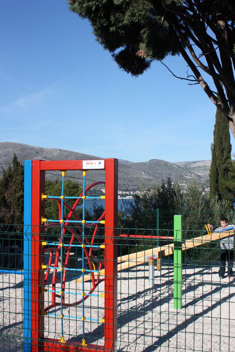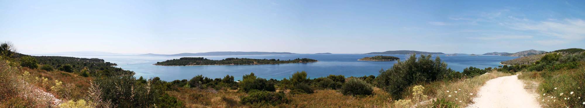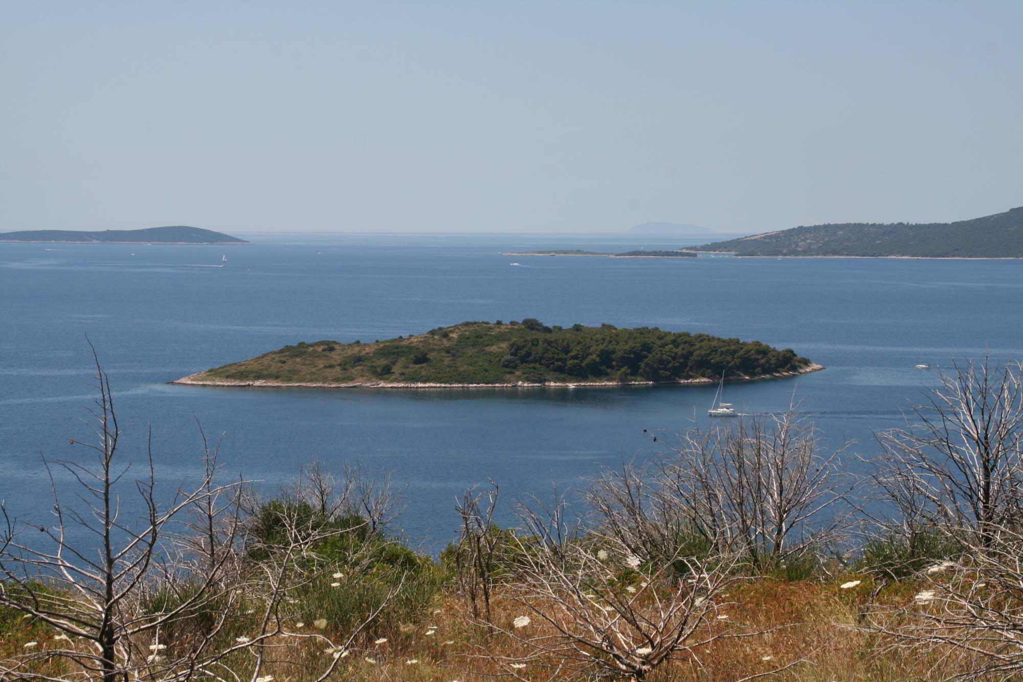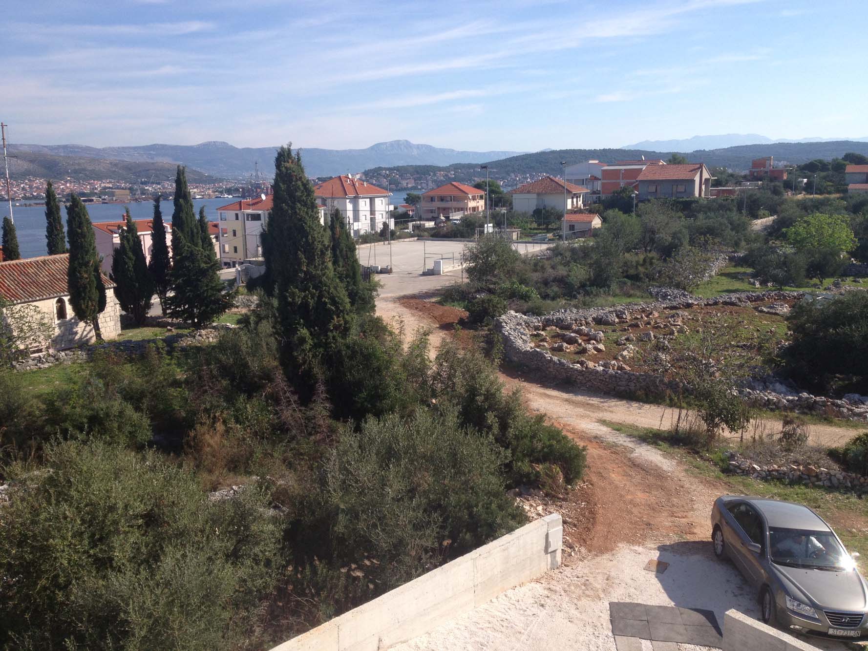 Zur anderen Seite Richtung Festland ist in 10 Minuten Fußweg der Badestrand, mit Liegeflächen, Abgrenzungen im Wasser, Bootsvermietung, Cafe und Restaurant, Spielplatz, Liegen und der Schiffsanlegestelle nach Trogir. Entlang des Kiefernwaldes gibt es 20 Minuten lang individuelle Badeplätze zwischen und auf den Felsen und im Kiefernwald. An der Spitze der Insel weitet sich das offene Meer mit dem Blick auf den Schiffsverkehr.