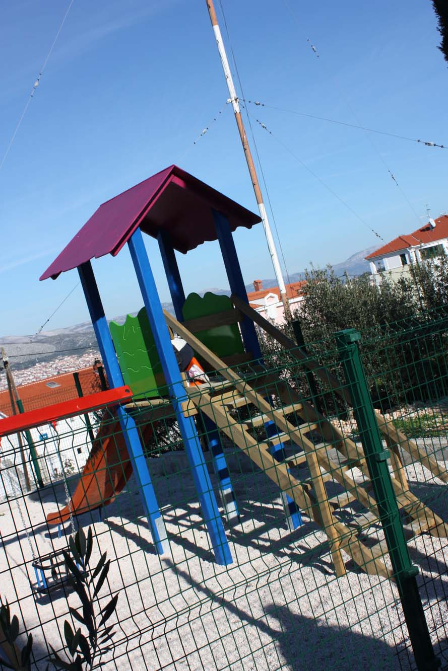In Rufnähe des Hauses ist ein kleiner Sportplatz, wo die Kinder Fußball und Basketball spielen oder auch Radfahren. Unsere Gästekinder können sich immer anschließen. So entstehen Kontakte und Freundschaften. 20 Schritte weiter ist ein eingezäunter Kinderspielplatz für Kleinkinder mit allen Geräten.